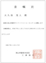 この度、岡山県警察本部より「サイバーパトロール・モニター」に委嘱されました。